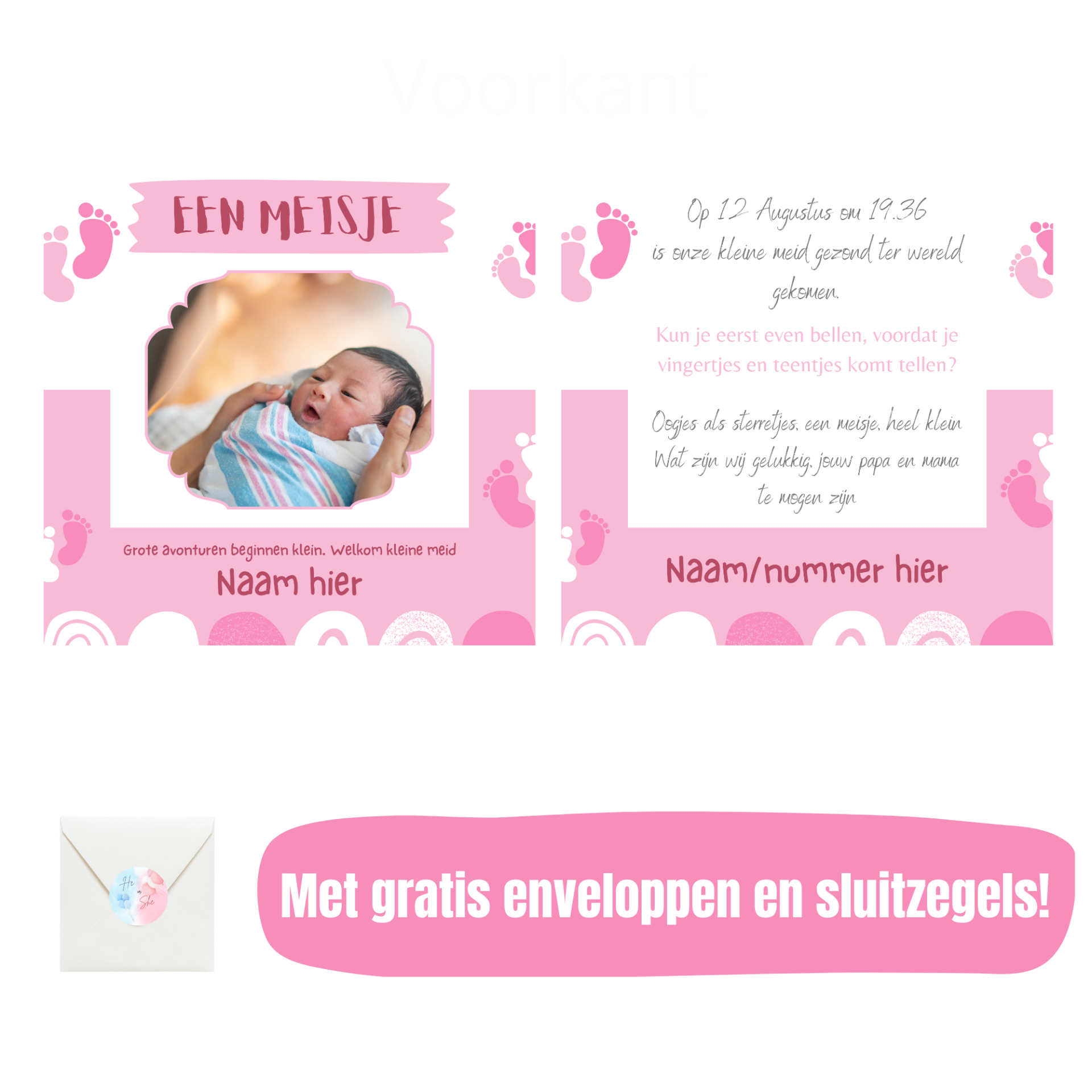 Dit lieve en kleurrijke ontwerp met schattige voetjes en een mooie foto van de kleine meid, is perfect om de geboorte van jullie kleintje aan te kondigen. Wij personaliseren het kaartje met jullie eigen details en voegen een foto van jullie wondertje toe!