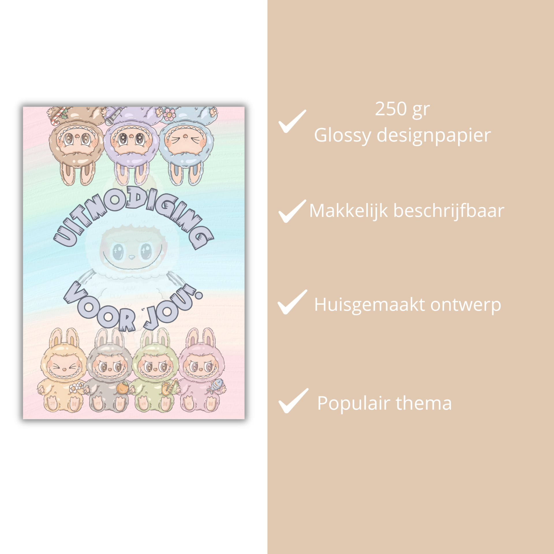 Deze uitnodiging is kant-en-klaar: je hoeft alleen nog zelf de naam, datum en tijd in te vullen. Gedrukt op hoogwaardig A6 designkarton (250g glanzend) en geleverd met gratis enveloppen én bijpassende sluitstickers – ready to party!