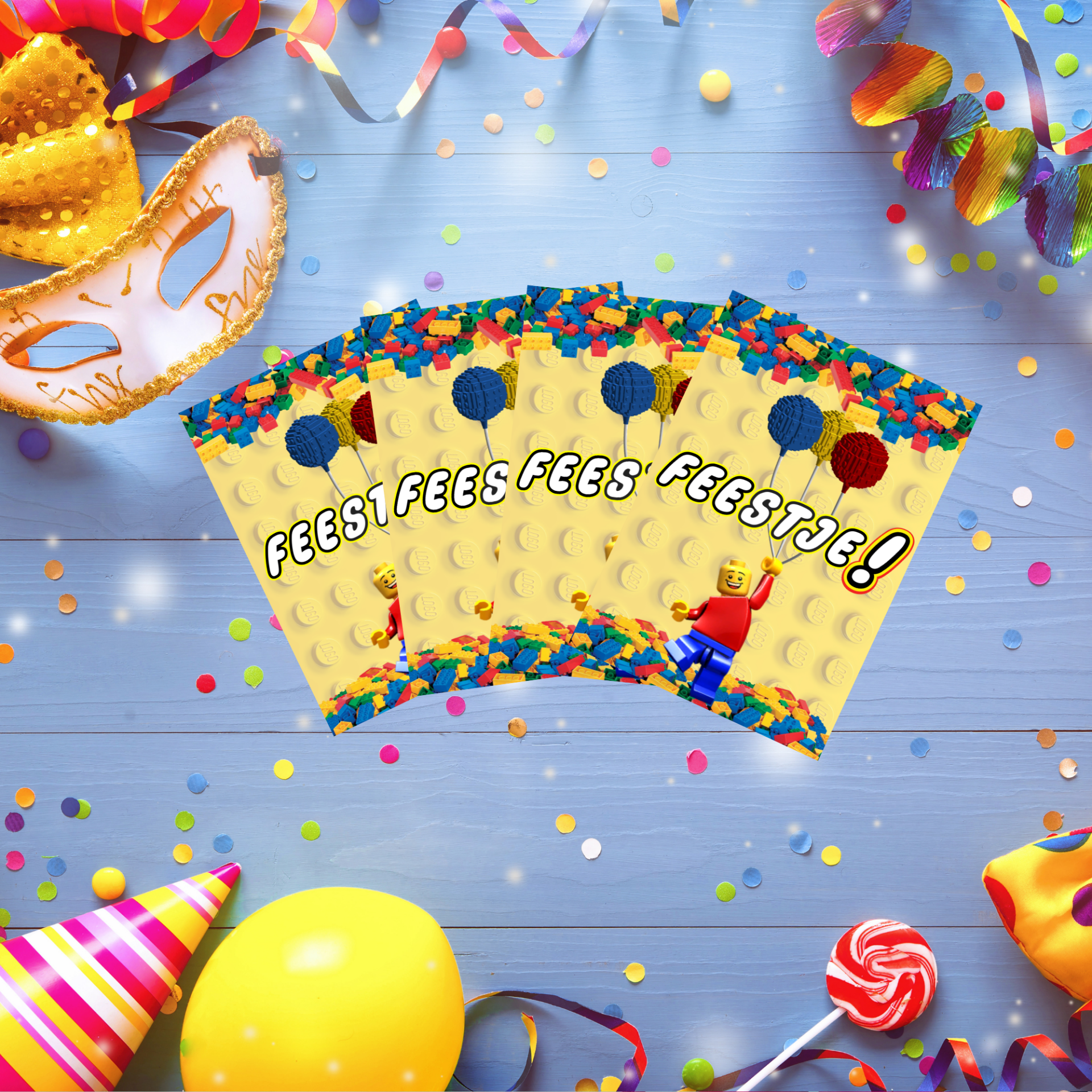 Deze kleurrijke LEGO uitnodiging is perfect voor echte bouwmeesters in de dop. Met klassieke LEGO-blokjes, primaire kleuren en een speelse uitstraling nodigt dit kaartje uit tot een feest vol creativiteit en plezier. Je vult zelf eenvoudig de naam, datum, tijd en locatie in.