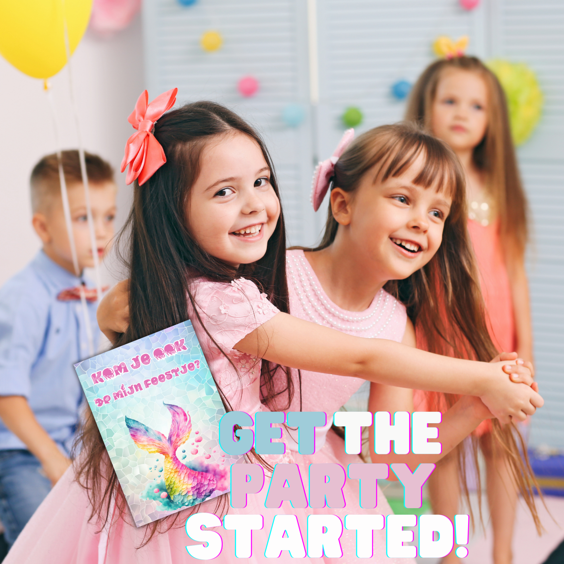 Deze kleurrijke zeemeermin uitnodiging is perfect voor kleine dromers die gek zijn op glitters, schelpen en onderwatermagie. Het vrolijke ontwerp met regenboogkleuren, zeesterren en schattige zeemeerminnen zorgt meteen voor feestkriebels!