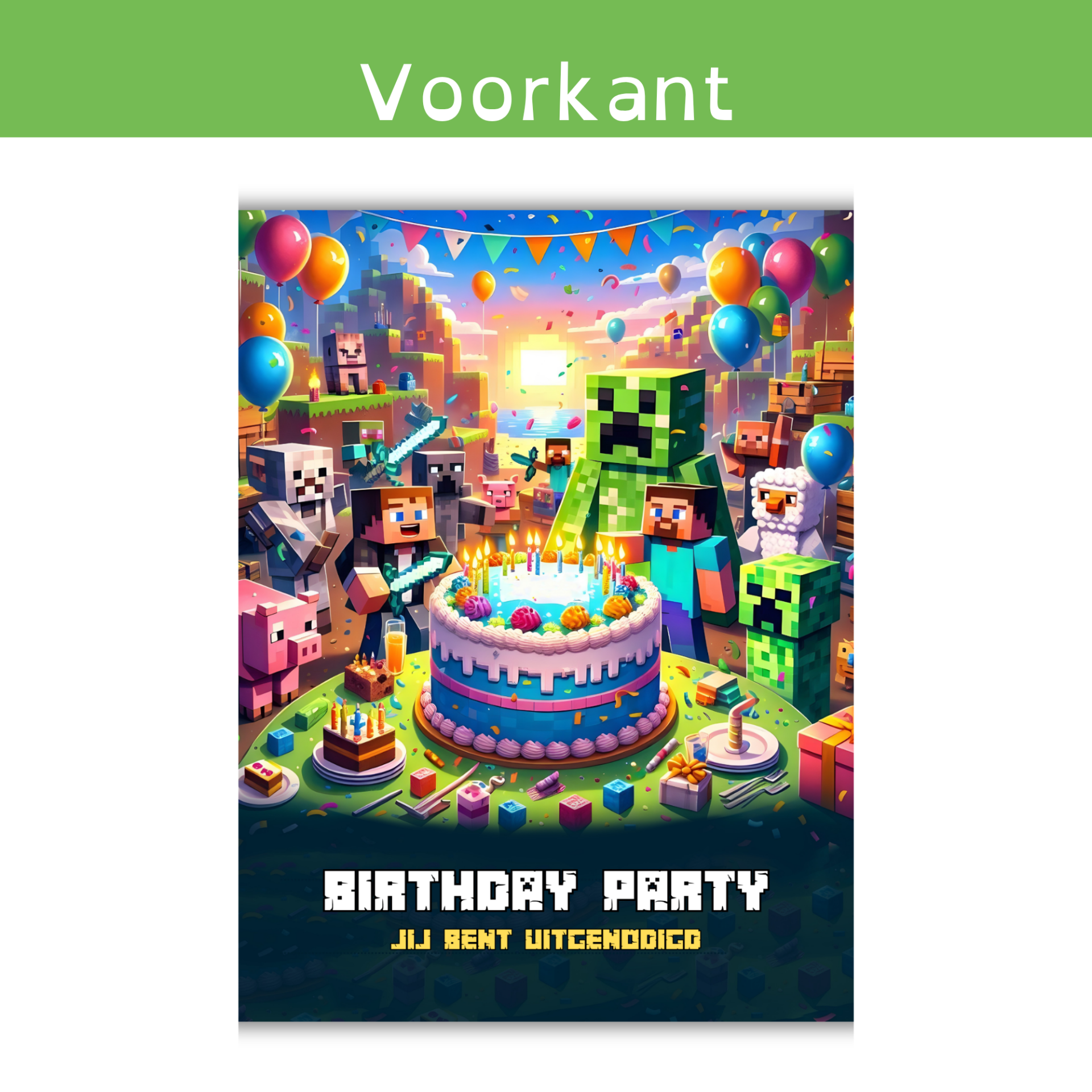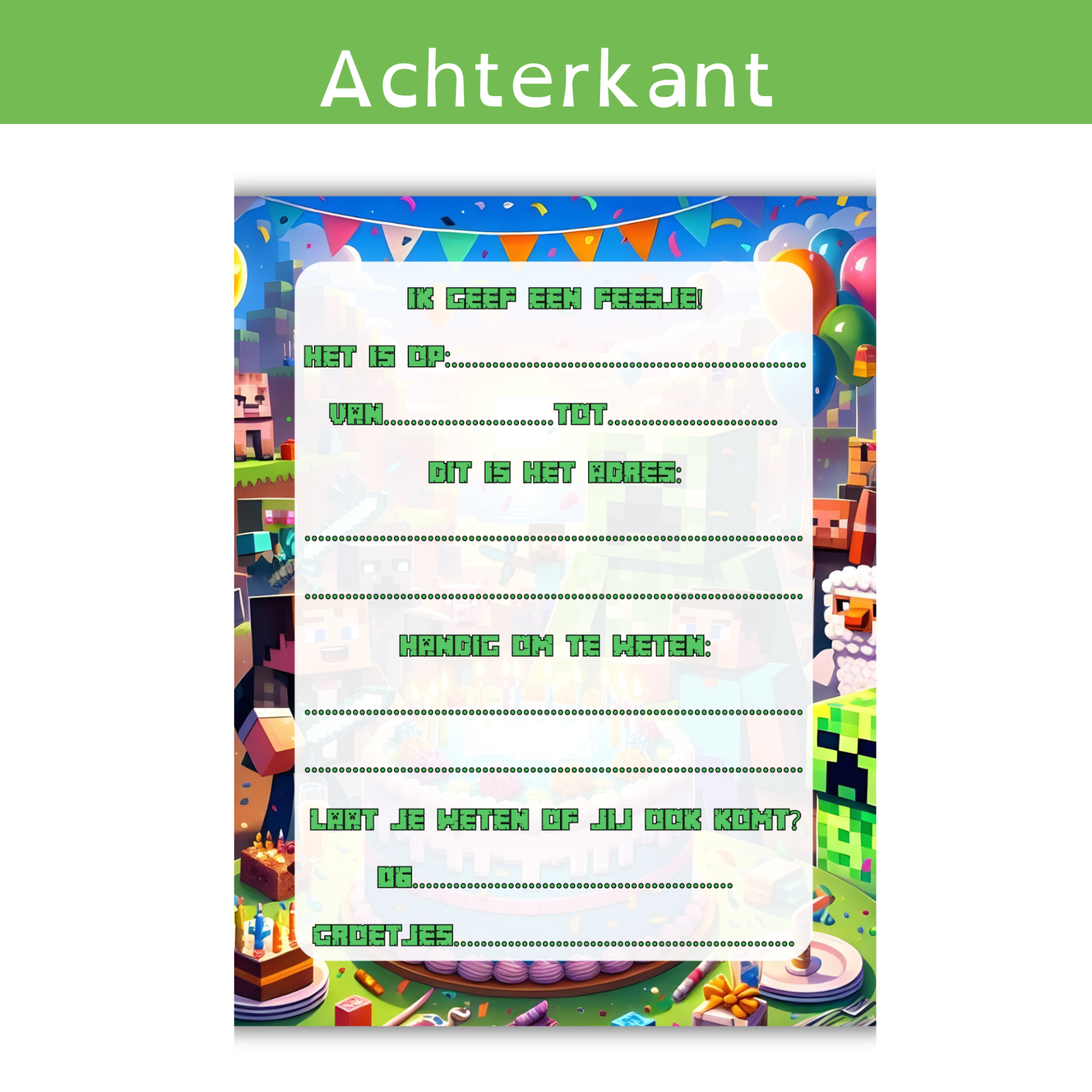 Deze feestelijke Minecraft uitnodiging zit vol vrolijke blokjes, slingers en game vibes! Met een kleurrijk design en herkenbare Minecraft-stijl is dit kaartje perfect voor kinderen die dol zijn op bouwen én feesten. De uitnodiging is kant-en-klaar: je vult zelf eenvoudig alle gegevens in op de achterkant.