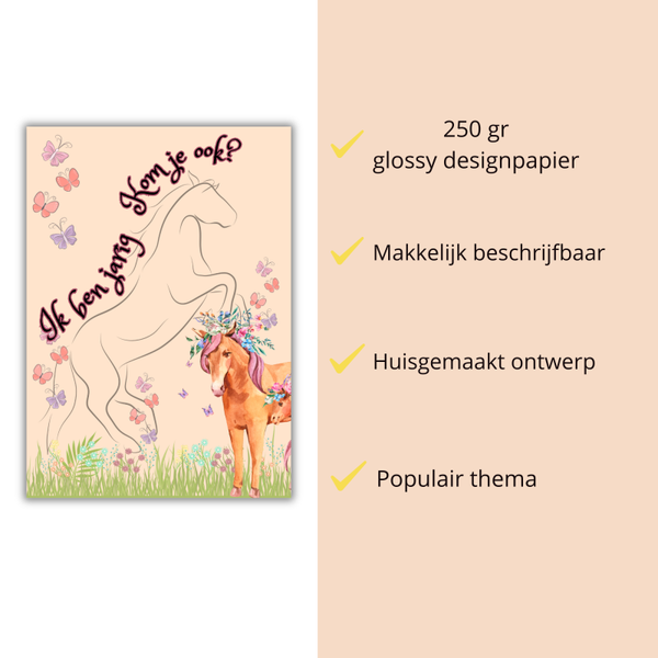 Je kunt op de achterkant van de kaart zelf eenvoudig naam, datum, tijd en locatie invullen. Gedrukt op stevig 250g glanzend designkarton (A6-formaat) en geleverd met gratis enveloppen en bijpassende sluitstickers in paardenthema.