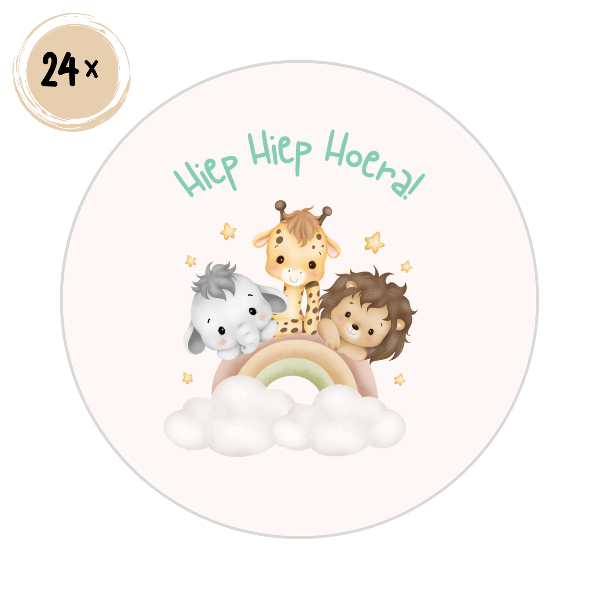 Vier feest in stijl met deze vrolijke traktatiestickers! De ronde stickers zijn bedrukt met schattige jungle dieren, zachte wolkjes en de feestelijke tekst Hiep Hiep Hoera. Perfect om traktatiezakjes, cadeautjes, uitnodigingen of enveloppen mee te versieren.