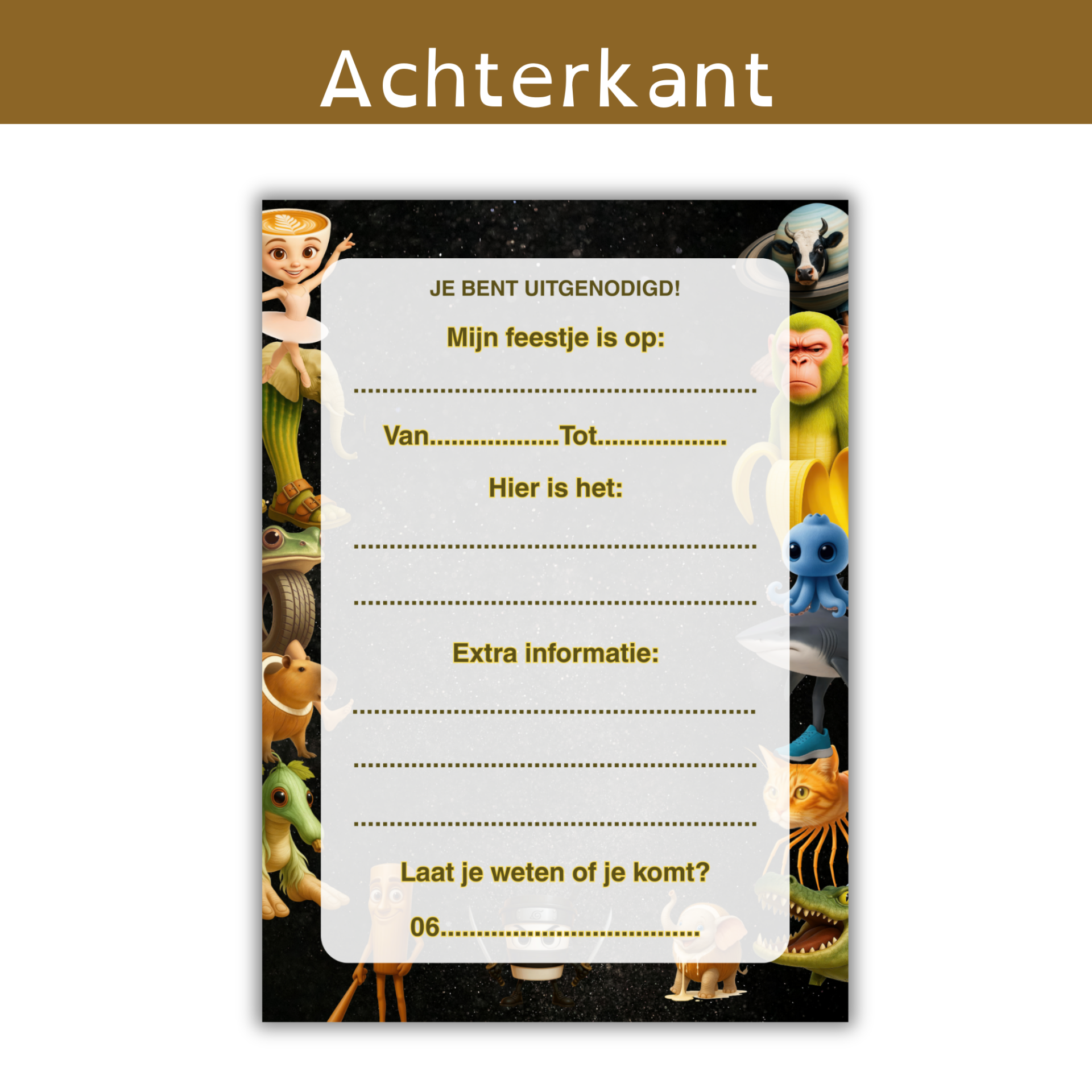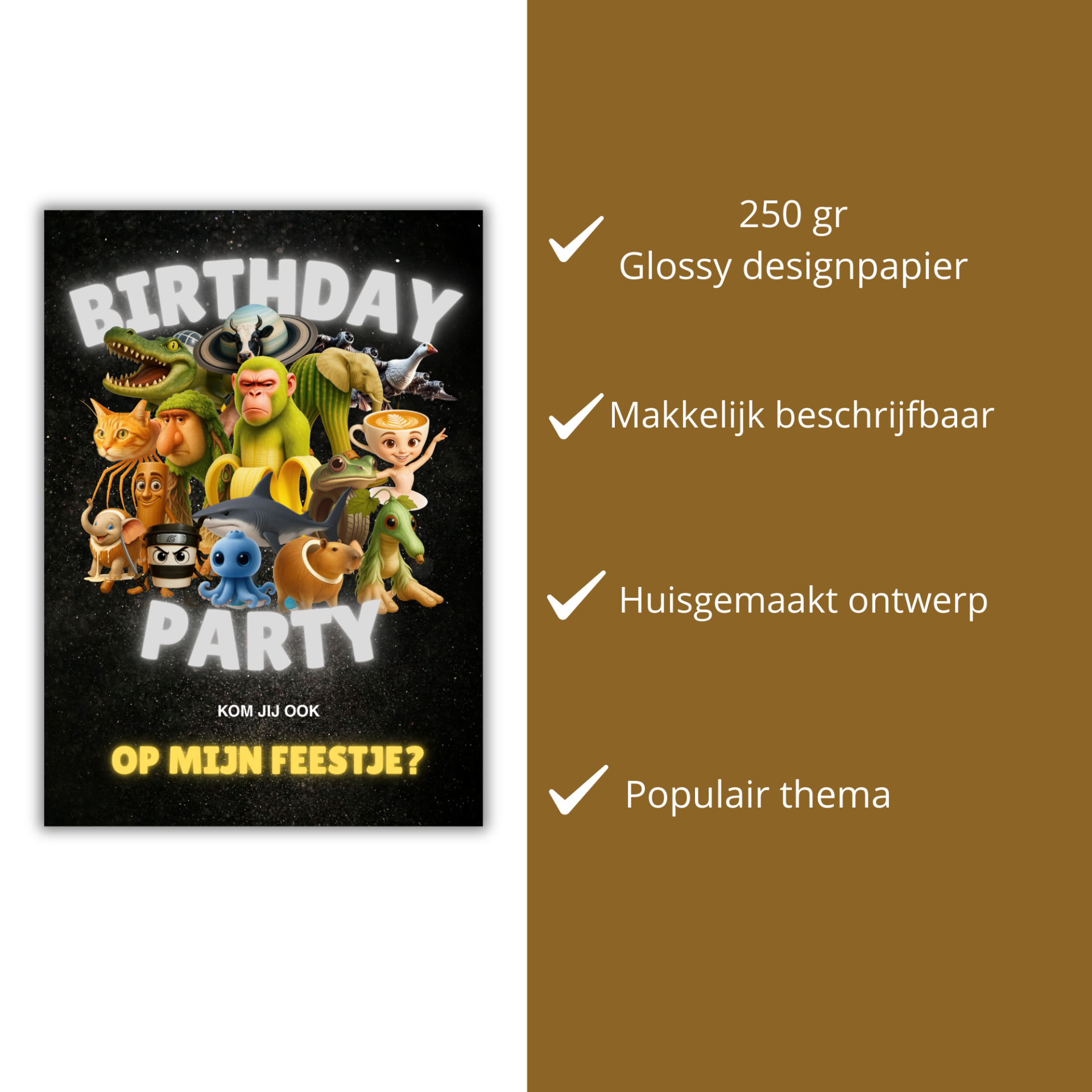 Geef jouw feestje een hilarische twist met deze unieke brainrot uitnodigingen! De kaart staat vol grappige en herkenbare figuurtjes die perfect passen bij de populaire online trend.