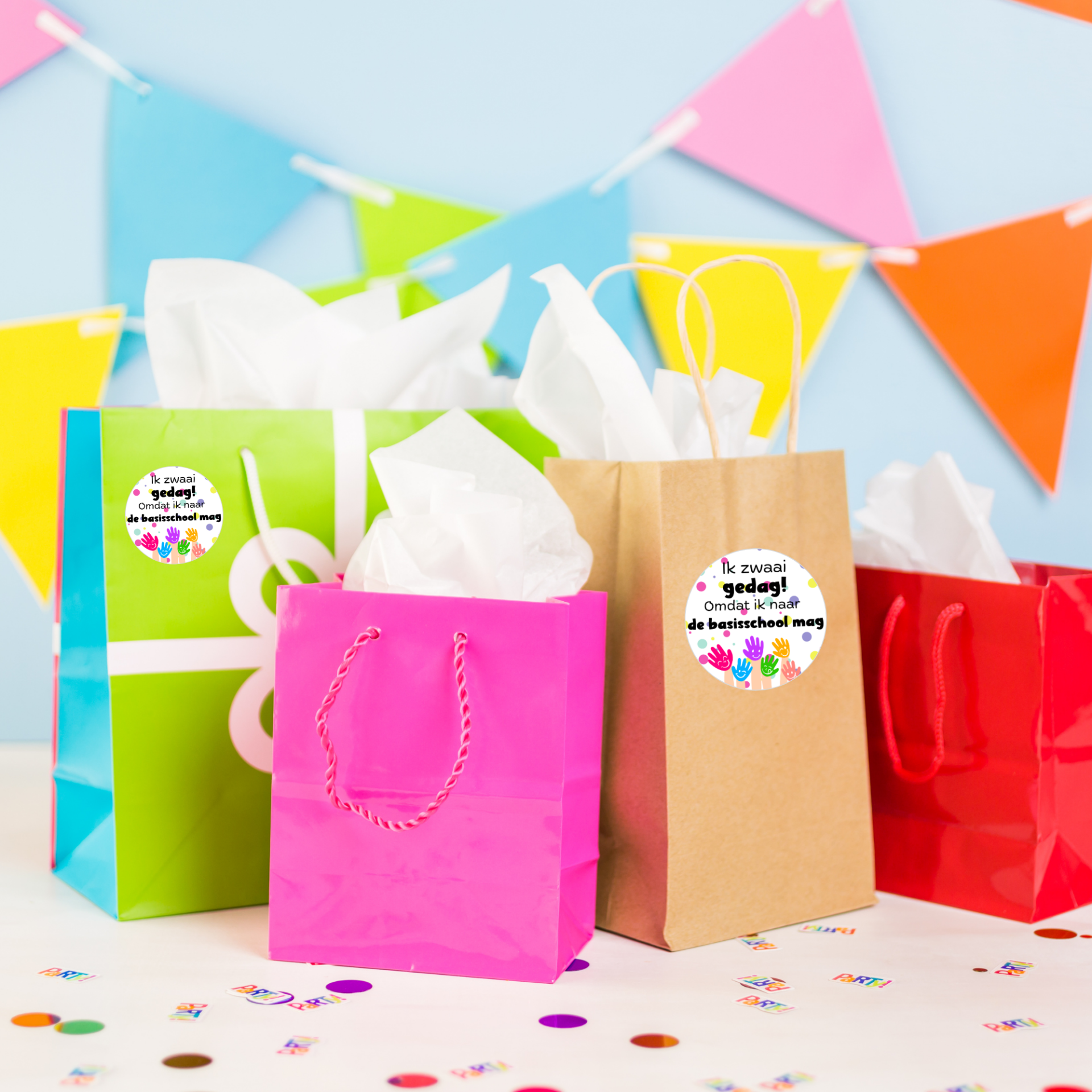 🎉 Tijd om afscheid te nemen van de kinderopvang of peuterspeelzaal? Met deze lieve traktatie stickers maak je het feestje compleet! Op de stickers staat de vrolijke tekst "Ik zwaai gedag omdat ik naar de basisschool mag", ideaal om uitdeelzakjes of kleine cadeautjes mee te versieren. Zo wordt het afscheid nét wat specialer.