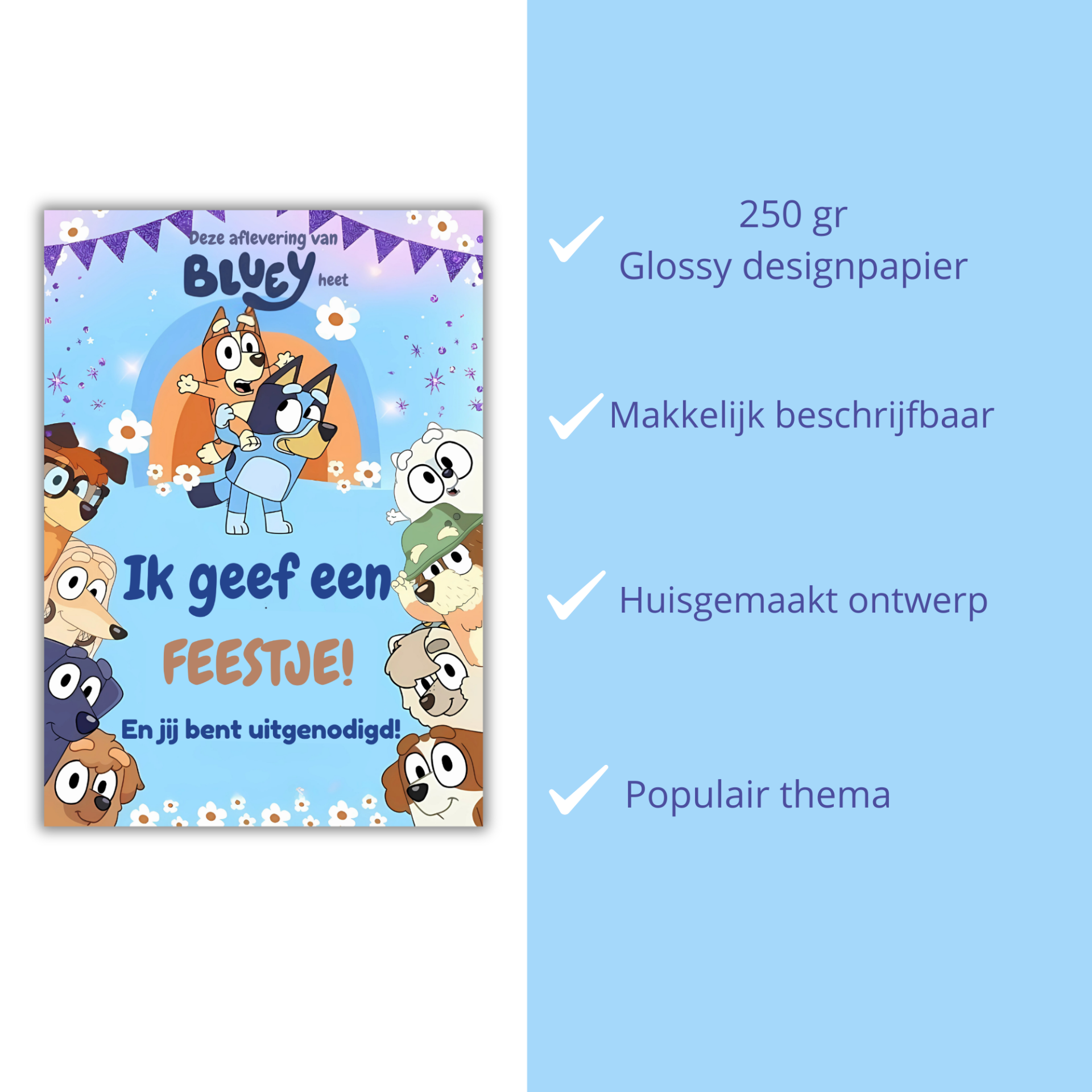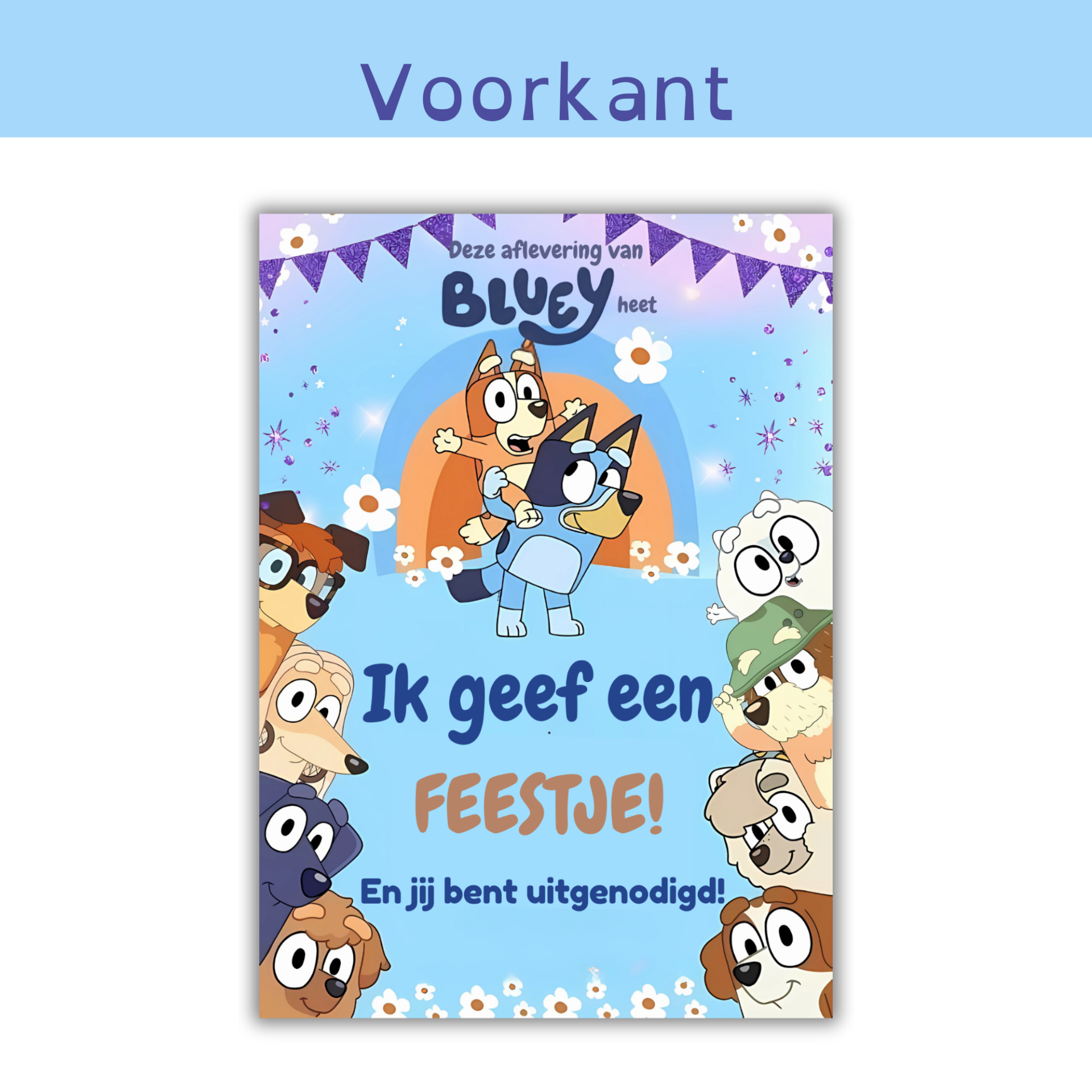 🎉🐾 Nodig vriendjes en vriendinnetjes uit in stijl met deze vrolijke Bluey uitnodigingen! De kaartjes zijn kant-en-klaar, zodat jij ze alleen nog maar hoeft in te vullen met de details van het feestje. Een superleuke manier om de voorpret te beginnen en het kinderfeestje extra feestelijk te maken.