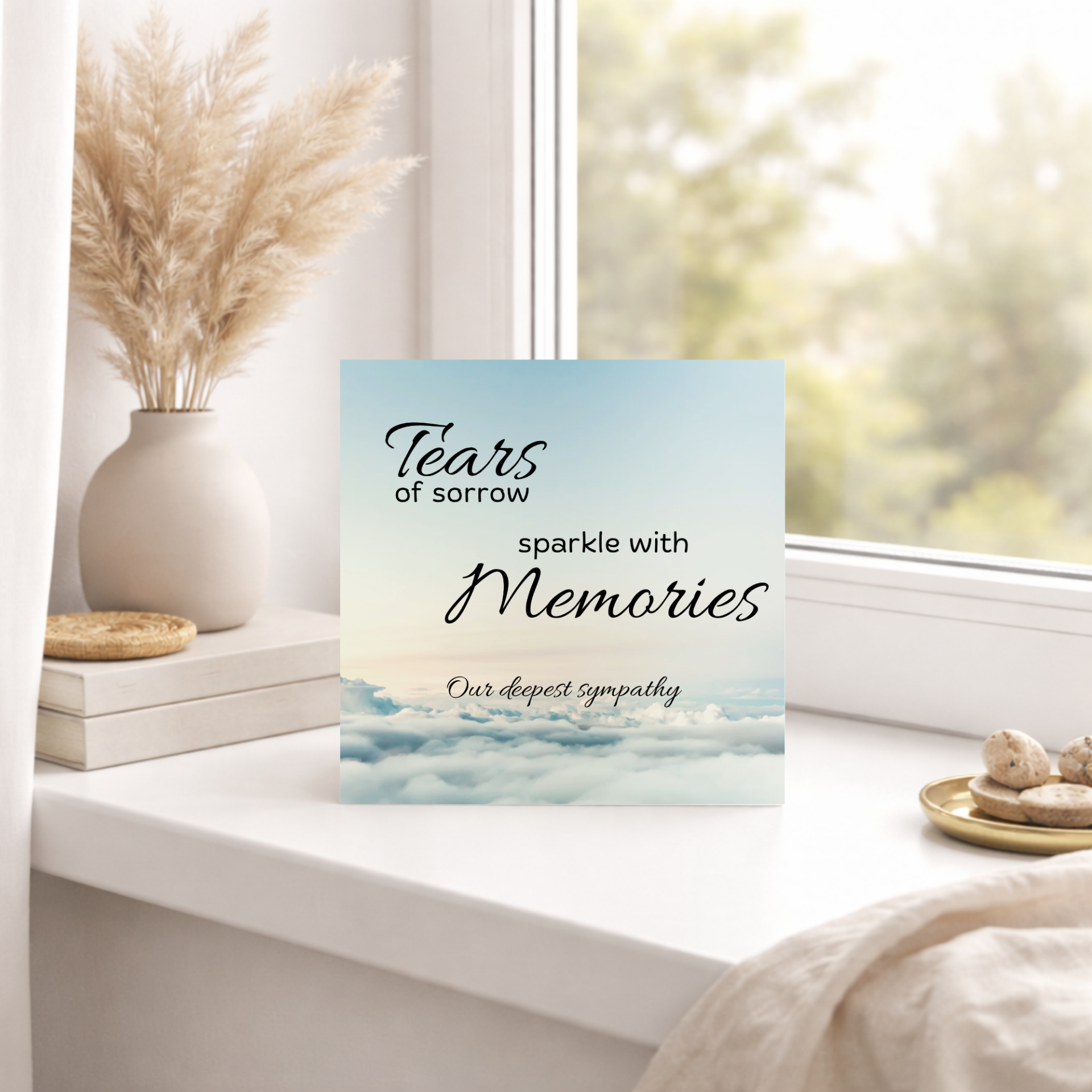 Een serene kaart met wolken en de tekst “Tears of sorrow sparkle with memories. Our deepest sympathy.” Een troostende kaart om medeleven te tonen.